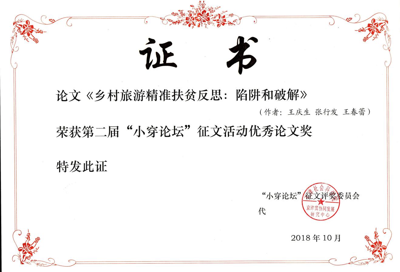 在征文征集阶段,共收到全国19个省(市、自治区)35个科研单位61位作者的论文共计73篇,其中的37篇收入《乡村振兴:买进新时代的农业和农村——第二届“小穿论坛”论文集》,经专家评审,最终有8篇论文获得“小穿论坛”征文优秀论文奖,我校太阳成集团tyc41183王庆生、张行发、王春蕾合写的论文“乡村旅游精准扶贫反思:陷阱和破解”获得优秀论文奖并收入《论文集》。