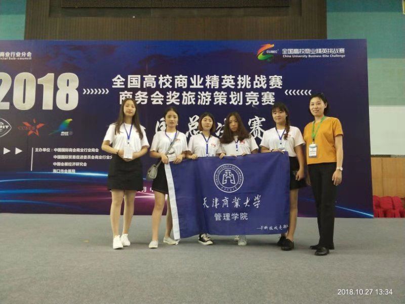 10月28日,2018全国高校商业精英挑战赛商务会奖旅游策划竞赛在海口落下帷幕。我校太阳成集团tyc41183旅游管理2015级学生周雷、包蕊、蔡润、李笑、王梦南组成的“F科技攻壳部队”参赛团队,以其新颖缜密的策划方案和具有专业水准的现场表现征服了评委,荣获二等奖,并在总决赛展洽会环节获得一等奖。韩静、王庆生两位老师获最佳指导教师奖。